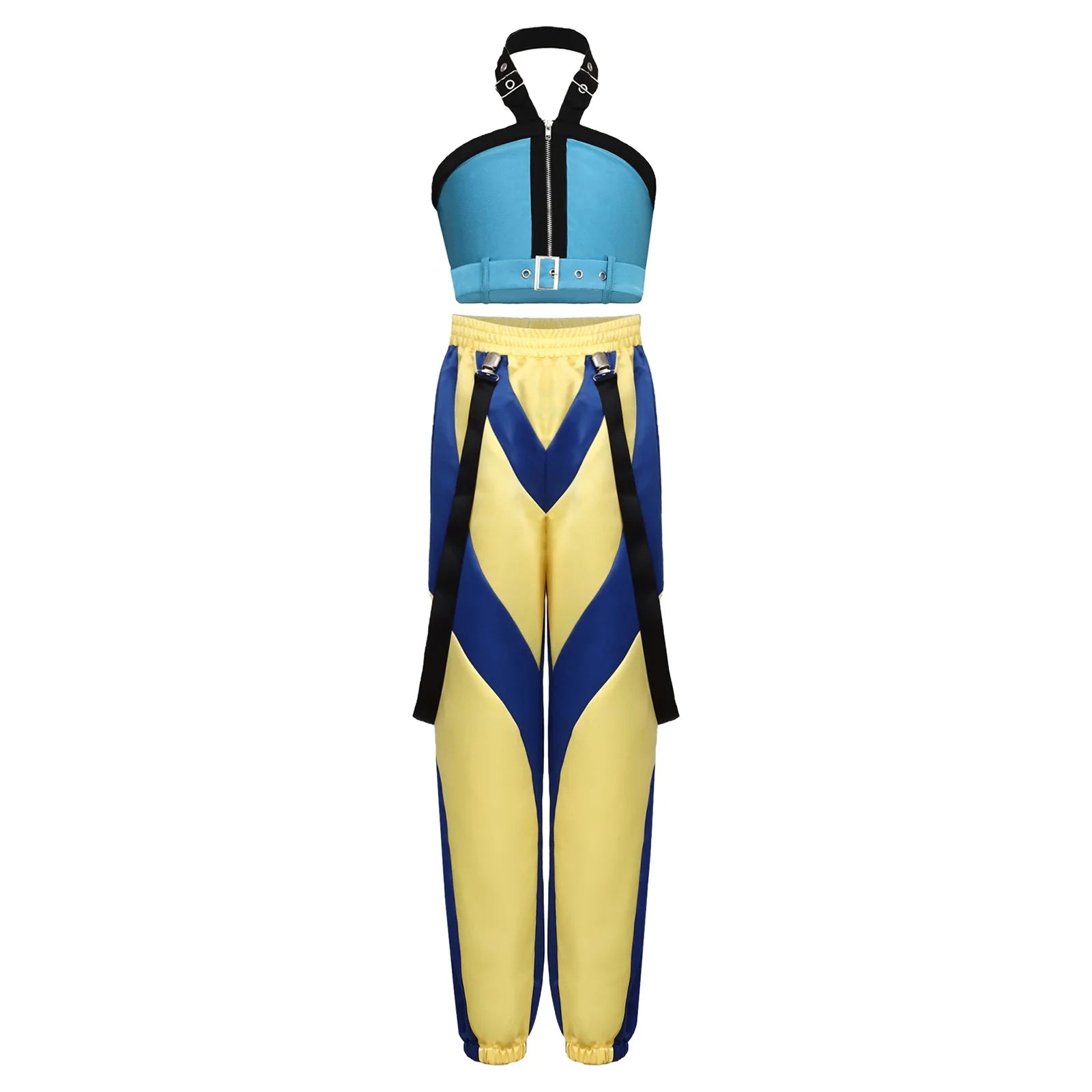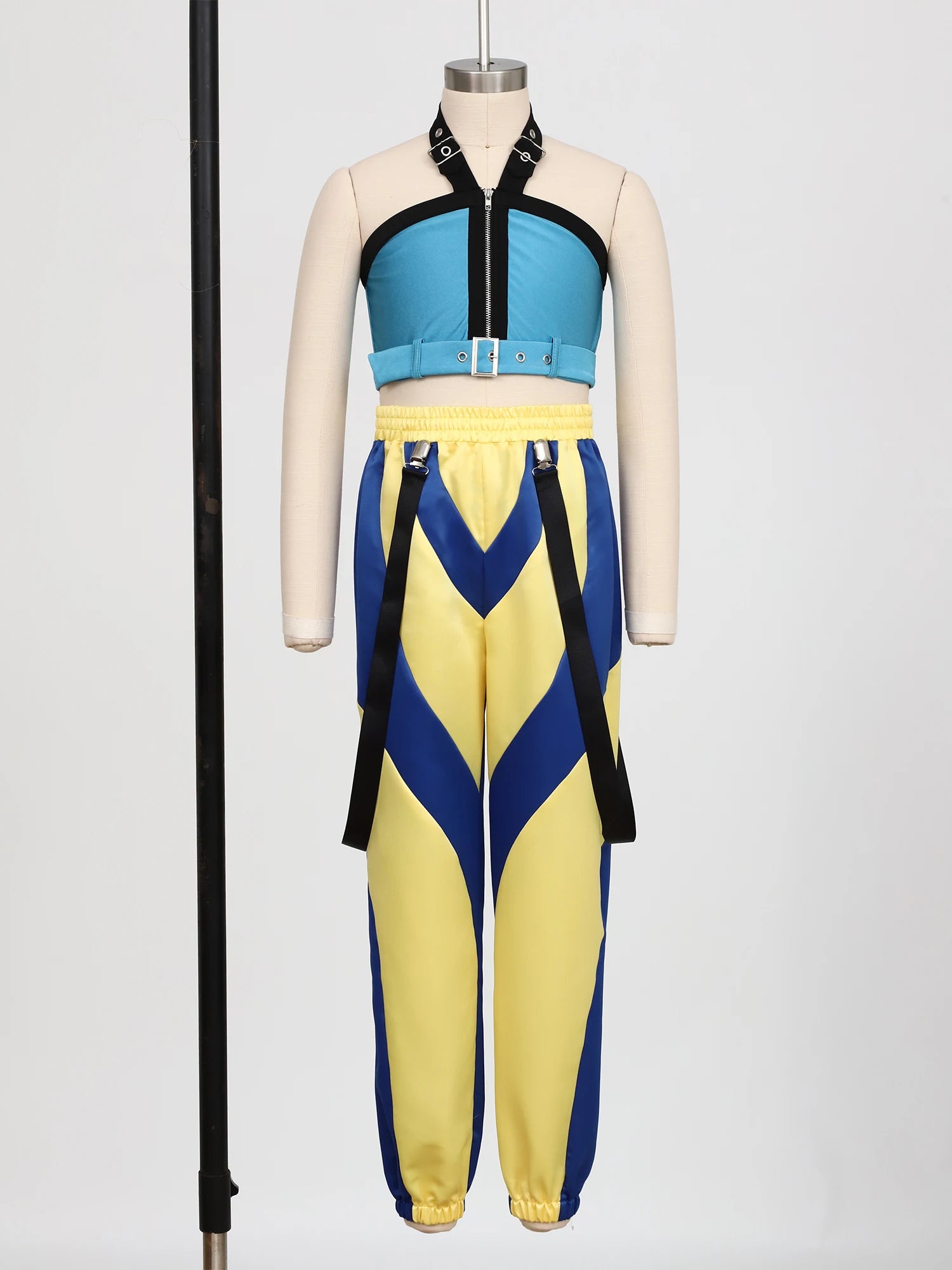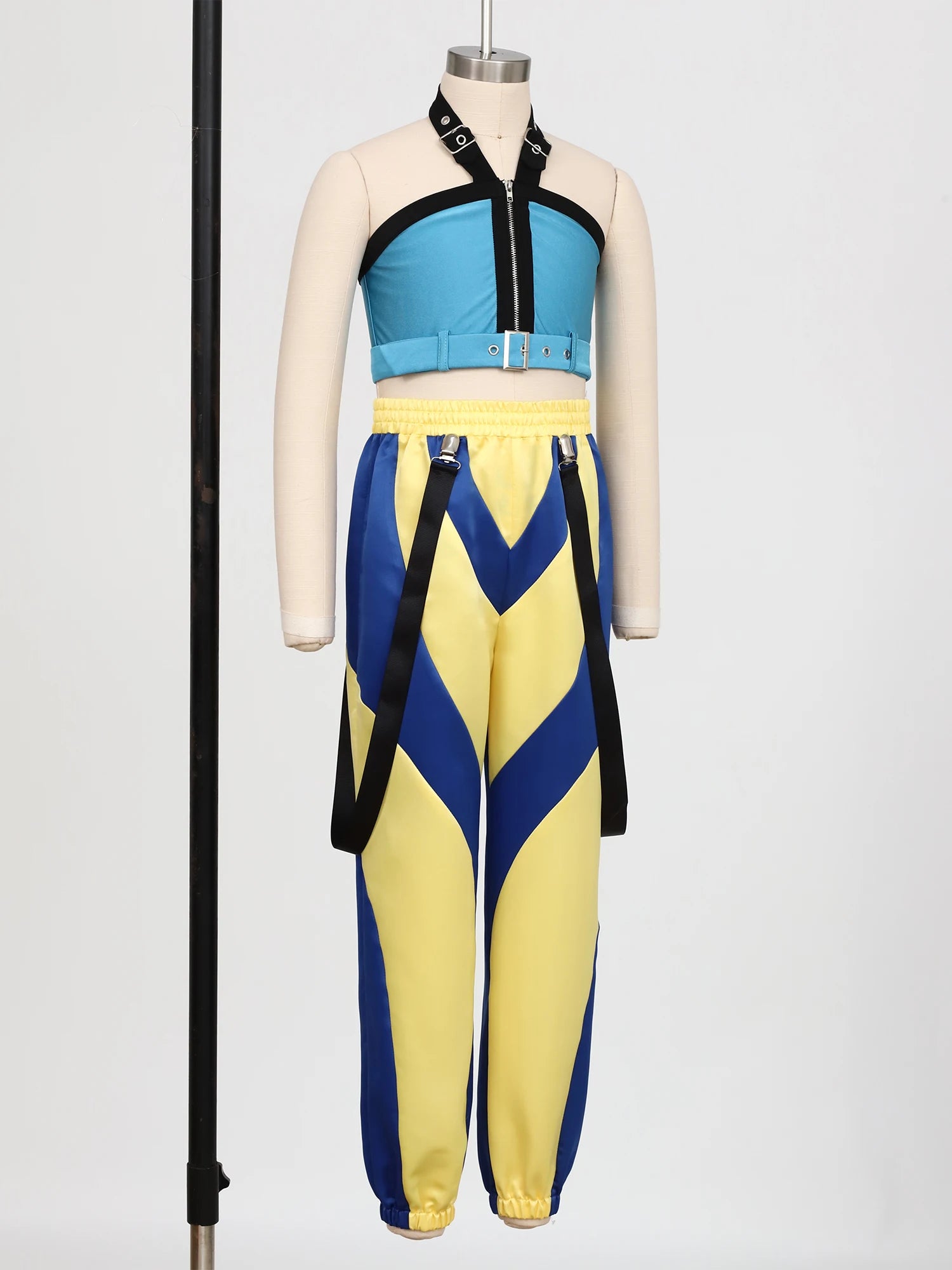 Ce costume de chasseuse de démons inspiré de la K-Pop pour filles comprend un haut court, un pantalon long et une ceinture.