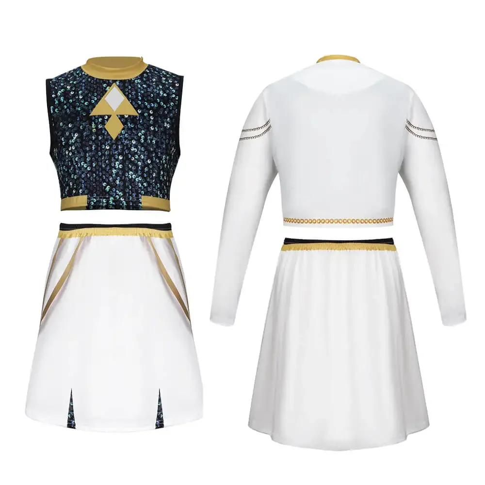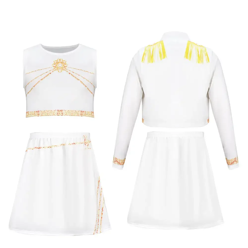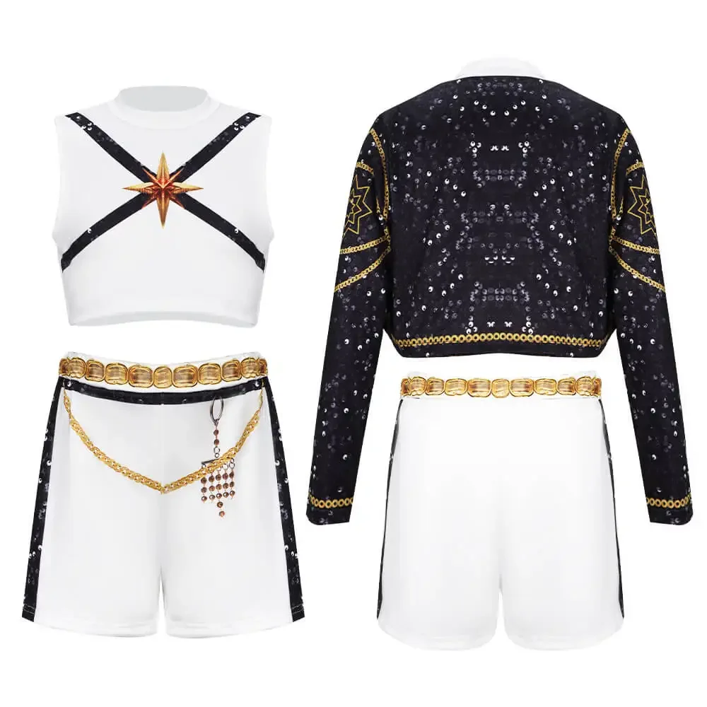 Ce costume Kpop Mira Zoey Rumi de Takerlama, en polyester durable, comprend un haut court, un manteau, et une jupe ou pantalon, parfait pour les enfants et adolescents. Idéal pour Halloween, cosplay ou soirées à thème, il se lave à la main à l'eau froide.
