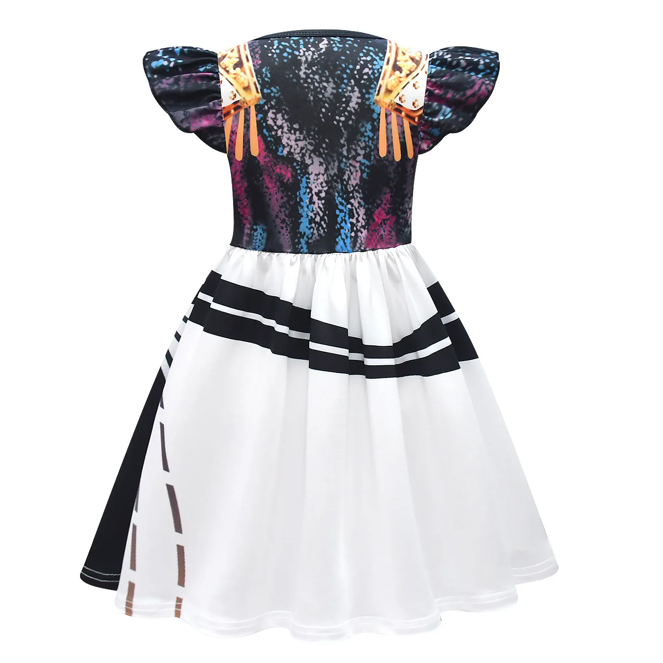 Fabriquée en tissu tricoté de coton et polyester, elle offre un style décontracté adapté au port estival. La robe présente un motif inspiré de dessins animés et une décoration drapée, avec un col rond pour un port facile.