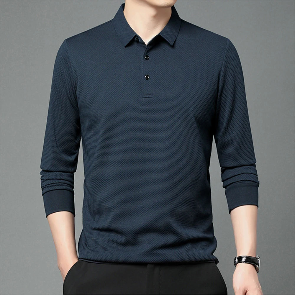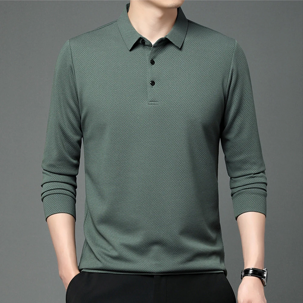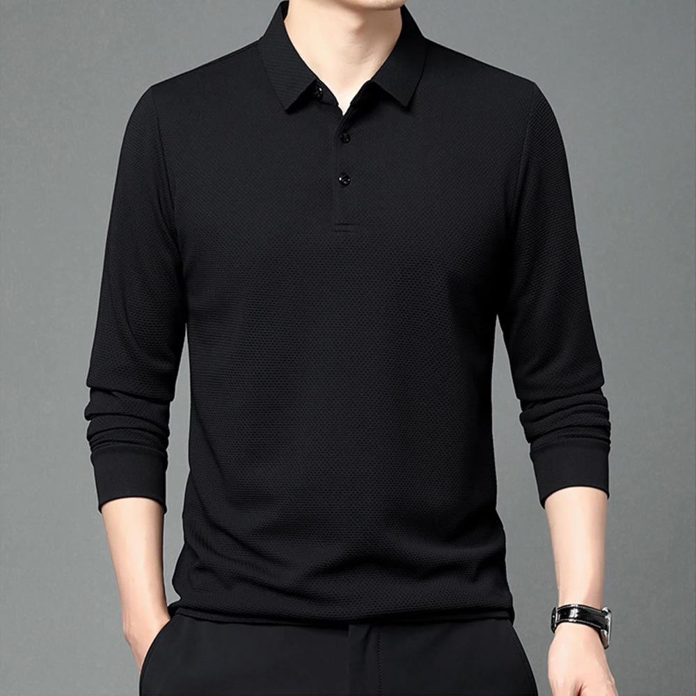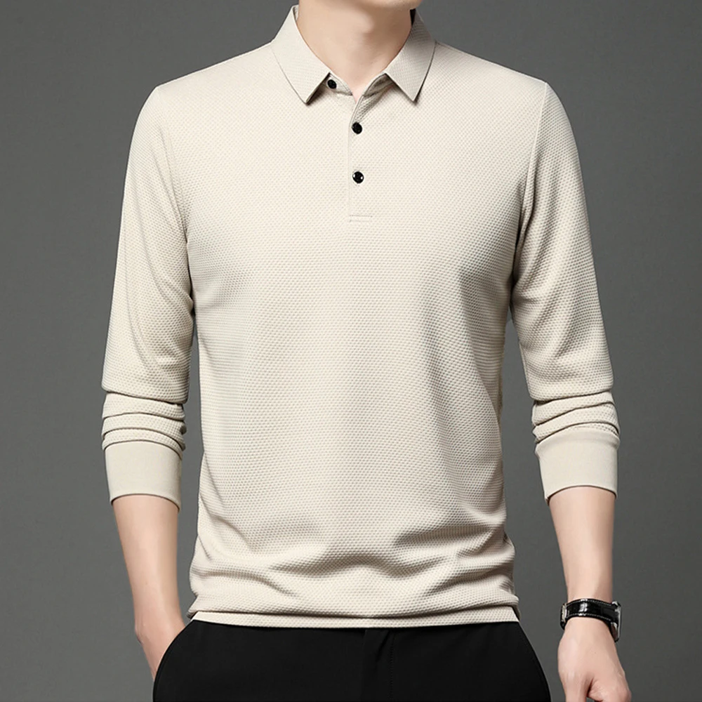 Nouveau t-shirt polo d'automne pour hommes, couleur unie, manches longues avec texture gaufrée