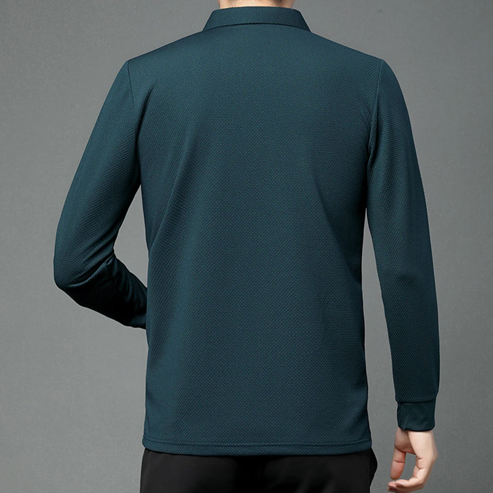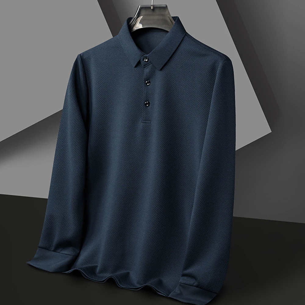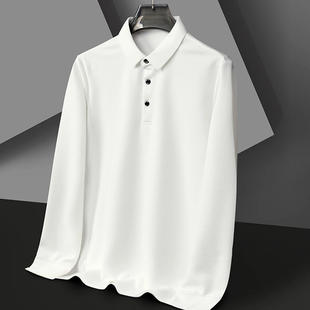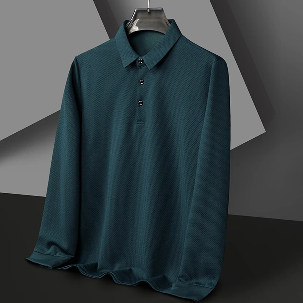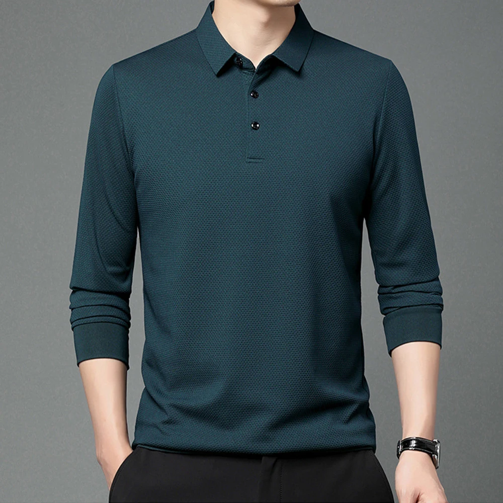 Nouveau t-shirt polo d'automne pour hommes, couleur unie, manches longues avec texture gaufrée